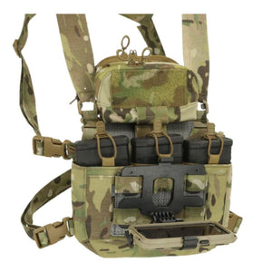 The Chesty ATAK Panel is a simple and secure way to integrate an ATAK device to the chest area of the Chesty Rig platform. The panel is constructed from a laser-cut thermoplastic and can be formed to user preference. Installation is simple with a hook and loop Velcro sandwich and elastic shock cord anchors. This expands the chesty platform vertically to provide a MOLLE interface and has uses beyond its primary intent, such as mounting our MOLLE Admin Panel. The body-side has loop Velcro to attach our soon to be released Kangaroo Insert - Half Pocket. Although designed with the Chesty Rig platform in mind, the panel may be compatible with other rigs.